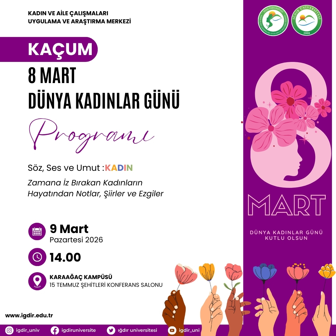 Üniversitemizin, Kadın ve Aile Çalışmaları Uygulama ve Araştırma Merkezi (KAÇUM) tarafından ''8 Mart Dünya Kadınlar Günü'' programı düzenlenecektir.