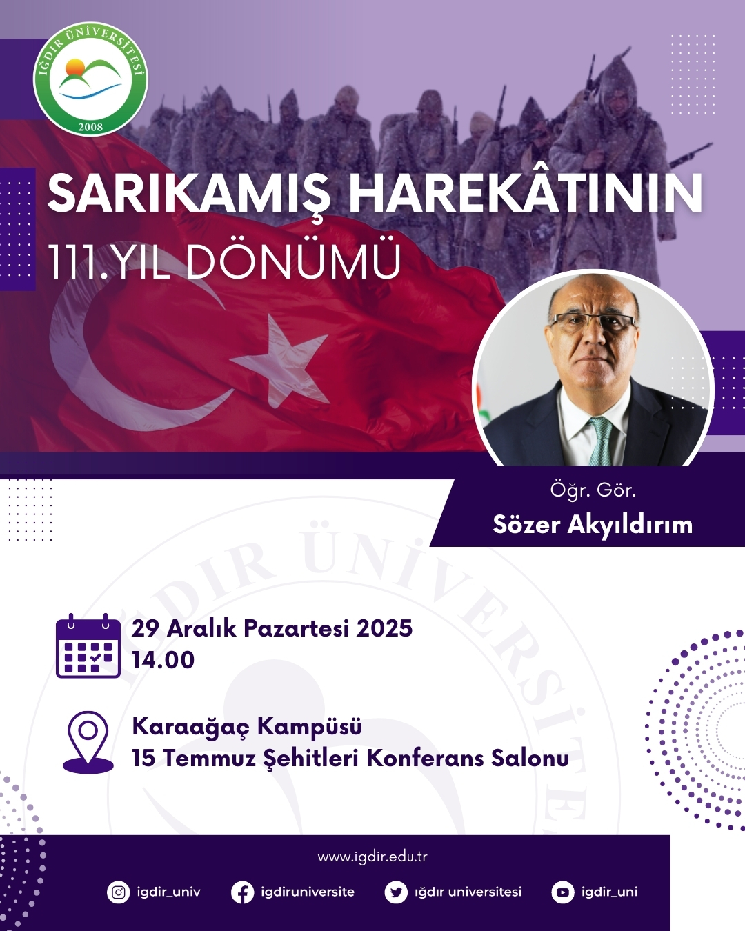 Üniversitemizde "Sarıkamış Harekatının 111. Yıl Dönümü" konulu konferans düzenlenecektir. Programa, tüm personel ve öğrencilerimiz davetlidir.