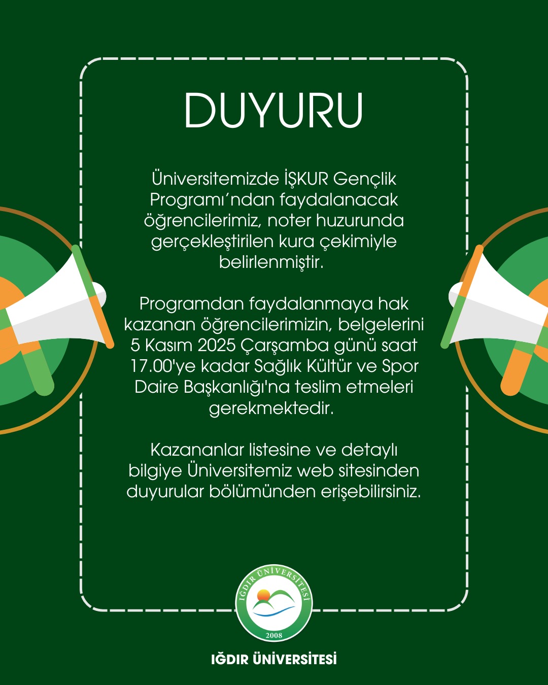 Programdan faydalanmaya hak kazanan öğrencilerimizin, belgelerini 5 Kasım 2025 Çarşamba günü saat 17.00'ye kadar Sağlık Kültür ve Spor Daire Başkanlığı'na teslim etmeleri gerekmektedir.