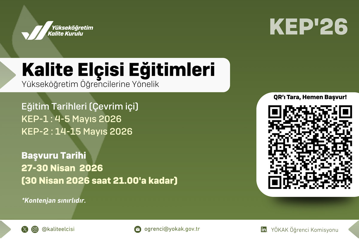 Detaylı Bilgiye https://www.yokak.gov.tr/2026/04/27/kalite-elcisi-egitimleri-kep26-duyurusu/ bağlantısından ulaşabilirsiniz.