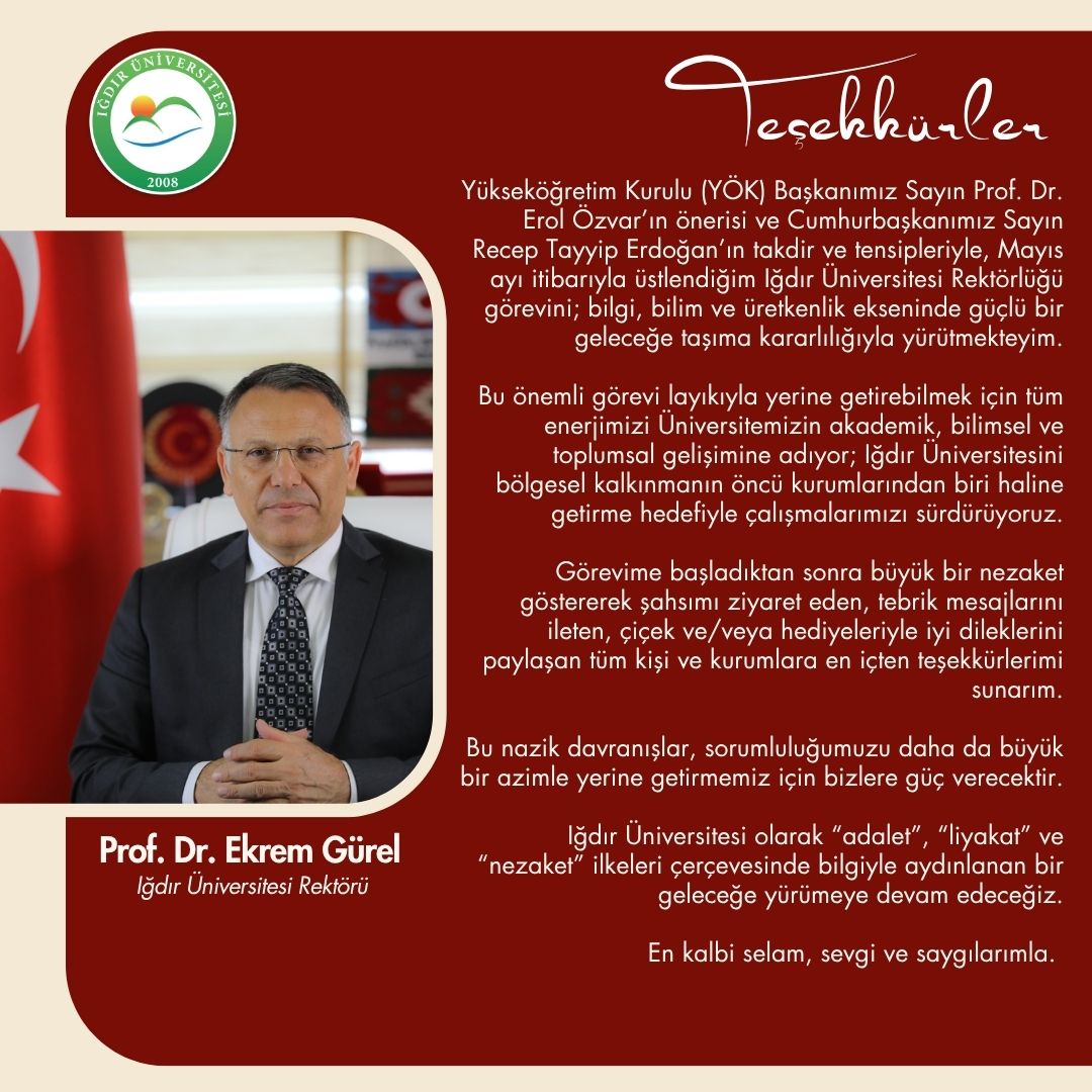 Yükseköğretim Kurulu (YÖK) Başkanımız Sayın Prof. Dr. Erol Özvar’ın önerisi ve Cumhurbaşkanımız Sayın Recep Tayyip Erdoğan’ın takdir ve tensipleriyle, Mayıs ayı itibarıyla üstlendiğim Iğdır Üniversitesi Rektörlüğü görevini; bilgi, bilim ve üretkenlik ekseninde güçlü bir geleceğe taşıma kararlılığıyla yürütmekteyim.