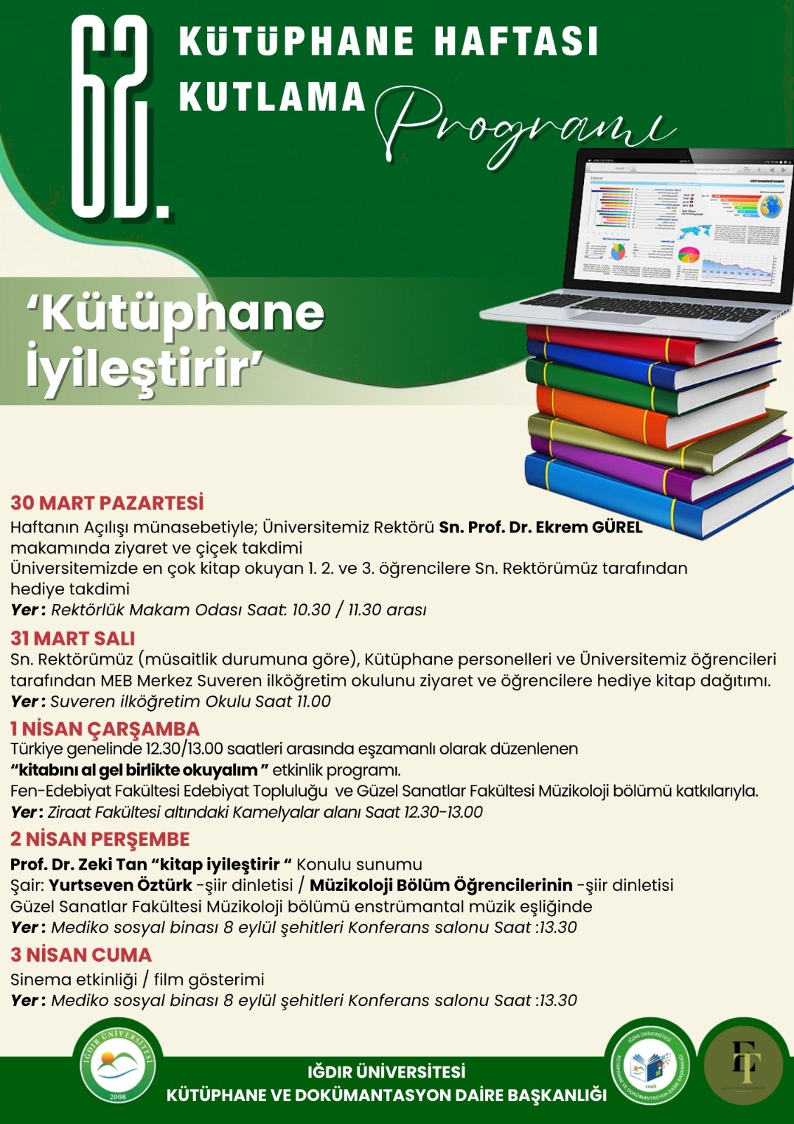 Üniversitemiz Kütüphane ve Dokümantasyon Daire Başkanlığı tarafından "62. Kütüphanesi Haftası" kapsamında bir takım etkinlikler düzenlenecektir. Programa ilişkin bilgiler aşağıdaki afişte yer almaktadır.
