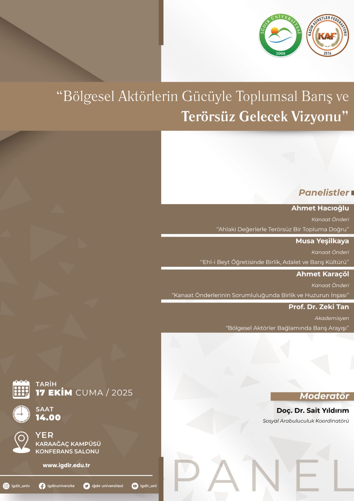 ​Üniversitemizde  "Bölgesel Aktörlerin Gücüyle Toplumsal Barış ve Terörsüz Gelecek Vizyonu" konulu panel düzenlenecektir. Programa tüm öğrenci, personel ve vatandaşlarımız davetlidir.