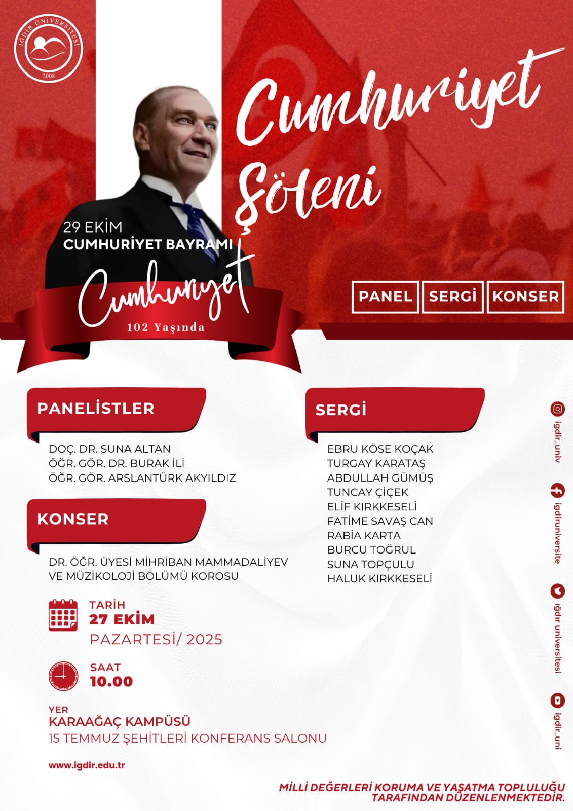 Iğdır Üniversitesi olarak düzenlediğimiz Cumhuriyet Şöleni’nde; Panel, Sergi ve Konser etkinlikleriyle dolu anlamlı bir program sizleri bekliyor.