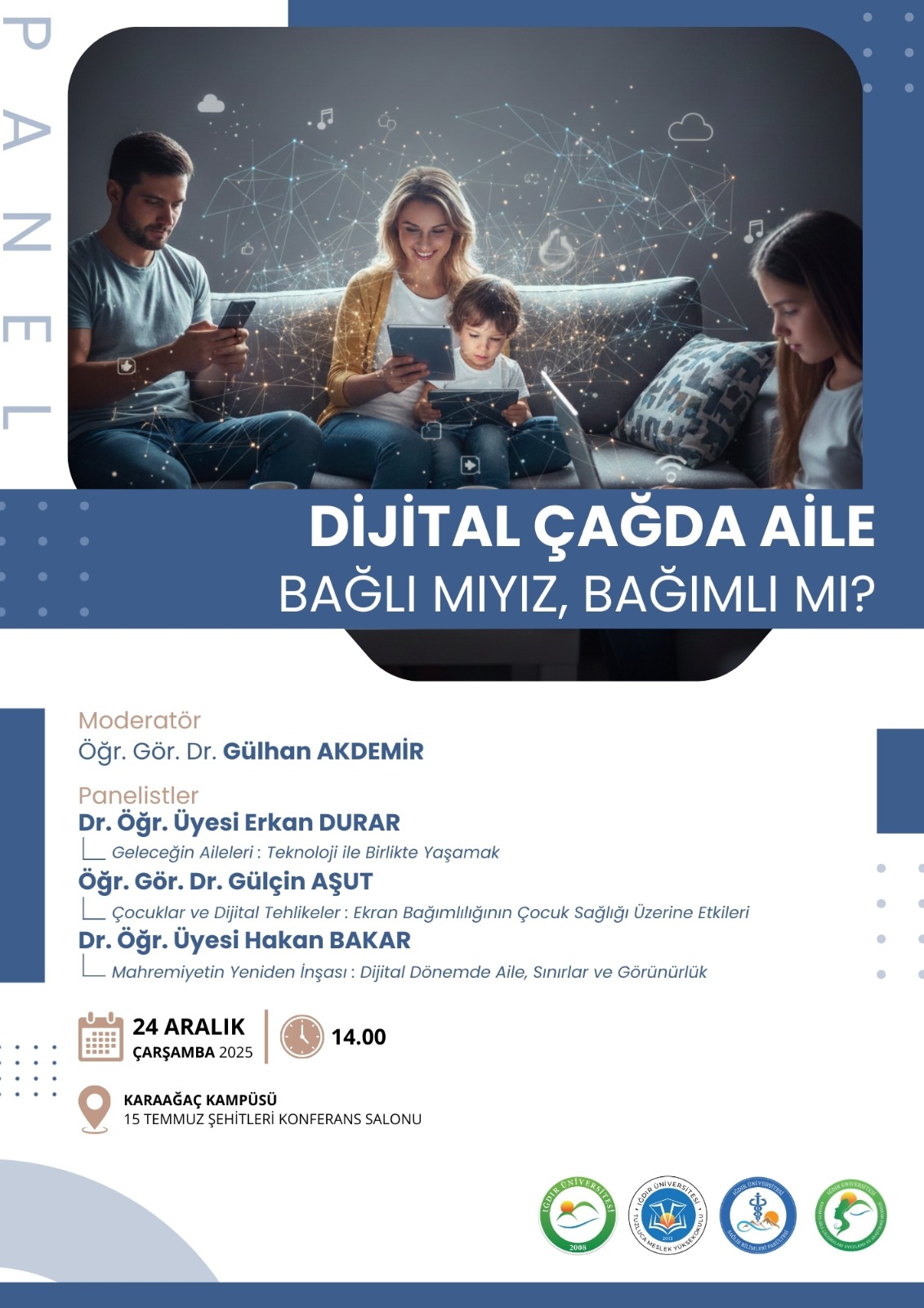Üniversitemizde 'Dijital Çağda Aile; Bağlı mıyız, Bağımlı mı?' konulu panel yapılacaktır. Programa tüm öğrenci, personel ve vatandaşlarımız davetlidir.