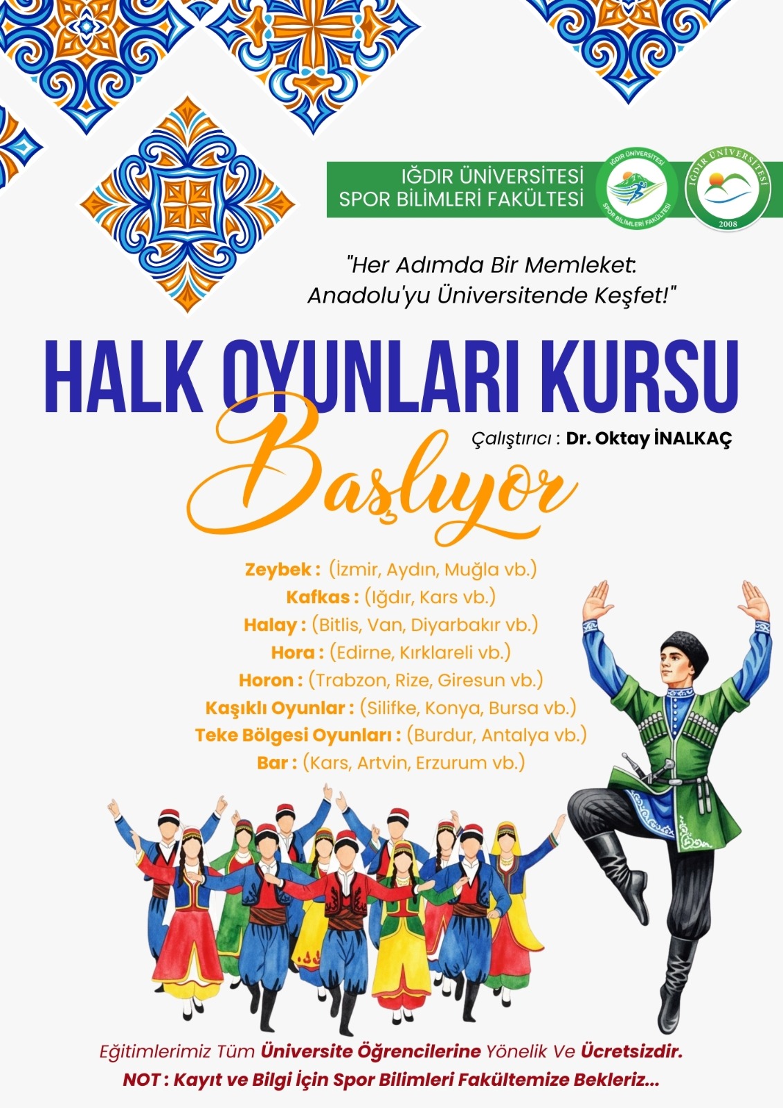 Üniversitemizde tüm üniversite öğrencilerine yönelik ve ücretsiz olan 'Halk Oyunları' kursu yapılacaktır.