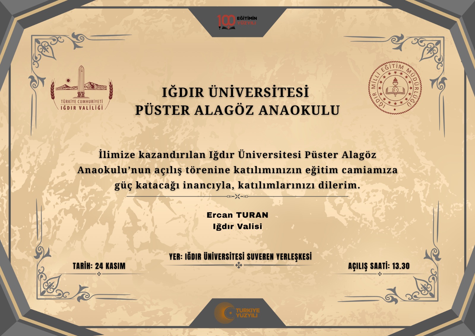 Iğdır Valisi Sayın Ercan Turan ve Iğdır Milletvekili Sayın Cantürk Alagöz’ün teşrifleriyle gerçekleşecek açılış törenimize davetlisiniz!