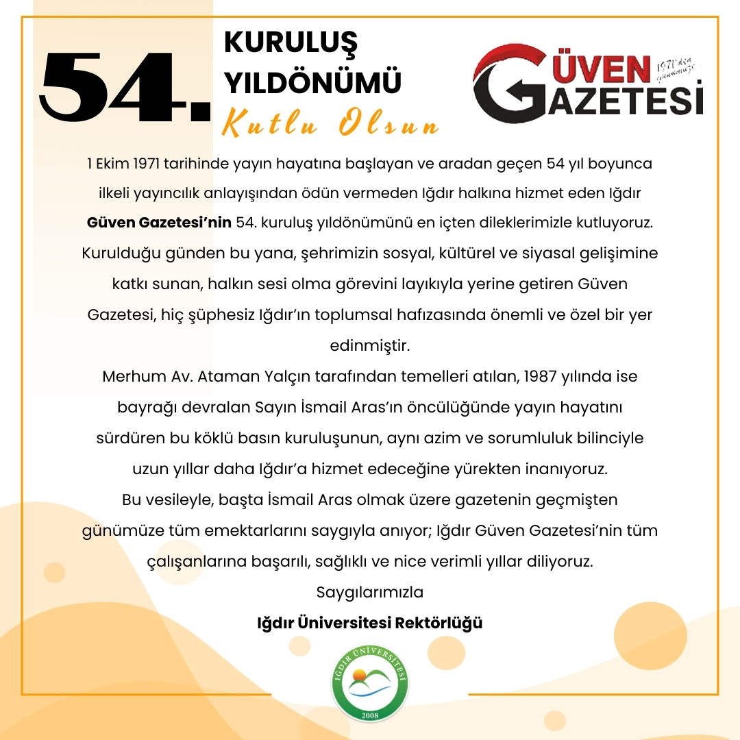 1 Ekim 1971 tarihinde yayın hayatına başlayan ve aradan geçen 54 yıl boyunca ilkeli yayıncılık anlayışından ödün vermeden Iğdır halkına hizmet eden Iğdır Güven Gazetesi’nin 54. kuruluş yıldönümünü en içten dileklerimizle kutluyoruz.