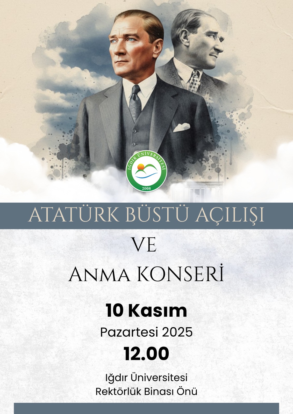 10 Kasım 2025 Pazartesi günü saat 12.00’de gerçekleştirilecek “Atatürk Büstü Açılışı ve Anma Konseri”ne davetlisiniz!